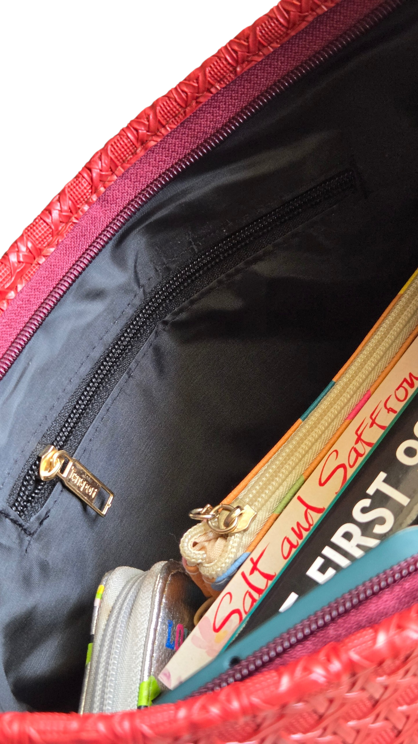 Other Detail: 1 inner zip pocket, 2 small inner open pockets, 1 outside back zip pocket
